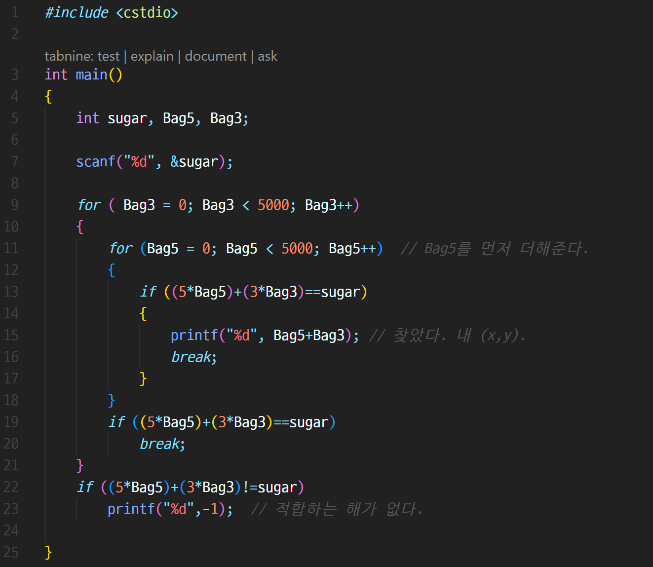 5kg 설탕 봉지가 더 많이 쓰이기 위해 이차원 반복문의 안쪽에 X를 더하는 for문을 넣어 (0,0), (1.0), (2.0) · · · (5000, 0), (0,1), (1,1) · · · (5000, 5000) 순으로 더해나가며, 위 조건식을 만족하는 순서쌍을 찾으면, 제일 작은 순서쌍을 반환하도록 만들었다. 다음 코드를 보자.
