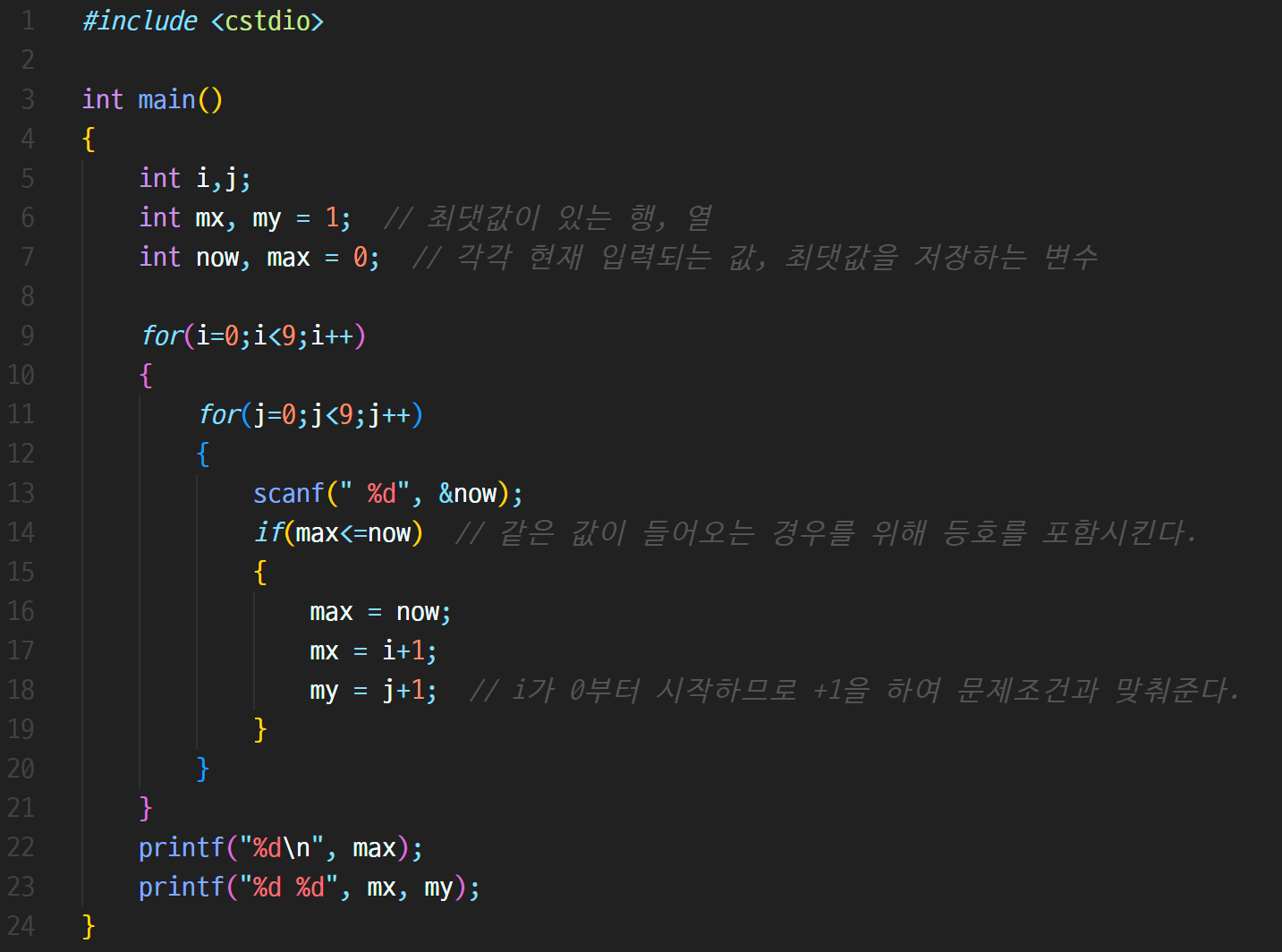 int mx, my = 1; // 최댓값이 있는 행, 열